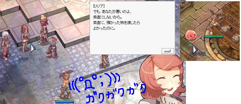 夜中、とーる2の必死さんたちの事を愚痴っていたら、黒い恋人のひとが遊びに連れてってくれました♪ 懐かしのふぇいよん最下層★ 前鯖ハム太でずっと通ってたなぁ('ε'○) なんて思いつつ… めっちゃ楽しかったです♪ EXPも増えたし、短時間でもアイテム美味しくて、アムムトも沢山! ありがとうございますっ☆また遊んでやって下さいーー(「・ω・)「♪ 消去前はアナウンスが入るんですね… 装備してても、いきなり持っていかれましたw 10秒前にもアナウンス。なんかやだ@@ 自分への転生祝いよ、さようなら。・゚・(ノД`)・゚・。 貧乏性のおかげで残ってた、昔のラグくじのやつなんですけどw